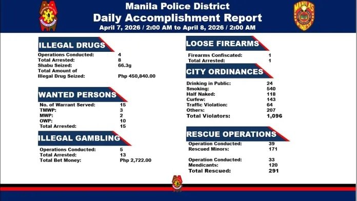 Umaabot sa 1,096 ang bilang ng mga indibidwal anf naaresto dahil sa paglabag sa iba’t ibang ordinansa sa Maynila.