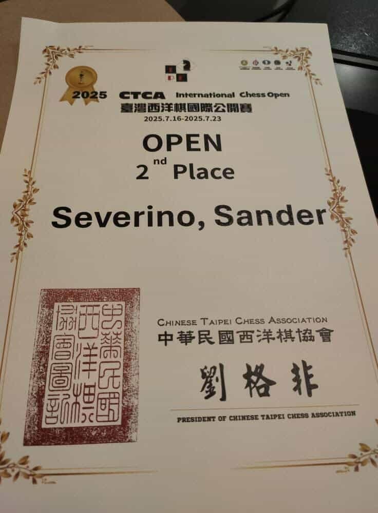 Nakamit ni FIDE Master (FM) Sander Severino ang medalya ng pilak sa standard chess open event sa 2025 CTCA International Chess Tournament na ginanap sa Taoyuan, Taiwan.
