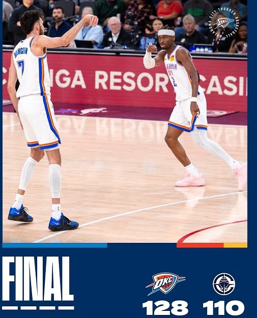 Nagbigay si center Chet Holmgren ng 30 puntos at 14 rebounds, at si NBA Most Valuable Player Shai Gilgeous-Alexander ay nagdagdag ng 20 puntos at 11 assists para sa reigning champion Thunder, na nagtala ng ikapitong sunod na tagumpay upang umangat sa 64-16 na record may dalawang laro na lang ang natitira sa regular season.